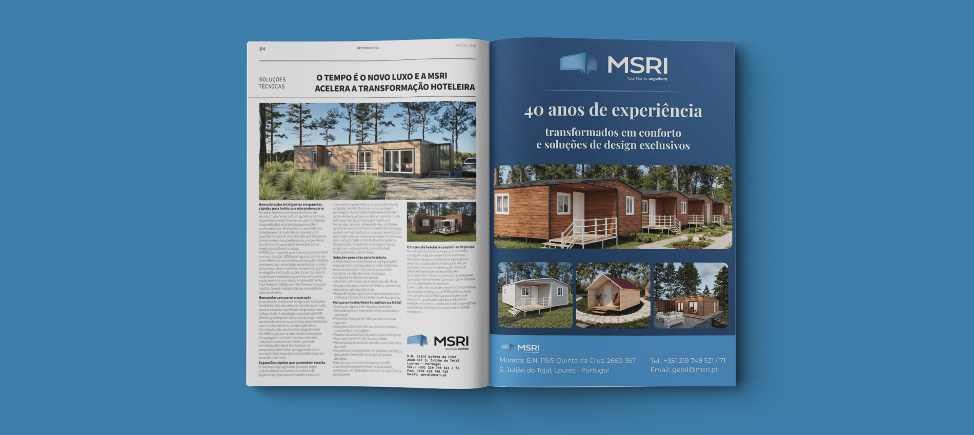 Com mais de 40 anos de atividade, a MSRI afirma-se hoje como uma das empresas mais sólidas na construção modular e em soluções habitacionais industrializadas em Portugal. Fundada em 1981, reúne quatro décadas de conhecimento especializado em habitação, turismo e mobiliário à medida. Esta continuidade, sem desvios de foco, transmite segurança a quem investe numa casa. Desde cedo apostámos na produção em fábrica de mobil homes e casas modulares, muito antes de esta abordagem se tornar tendência. Esse know-how permitiu-nos evoluir naturalmente para soluções de habitação permanente, respondendo à procura crescente e ao contexto atual de maior exigência no acesso à habitação.